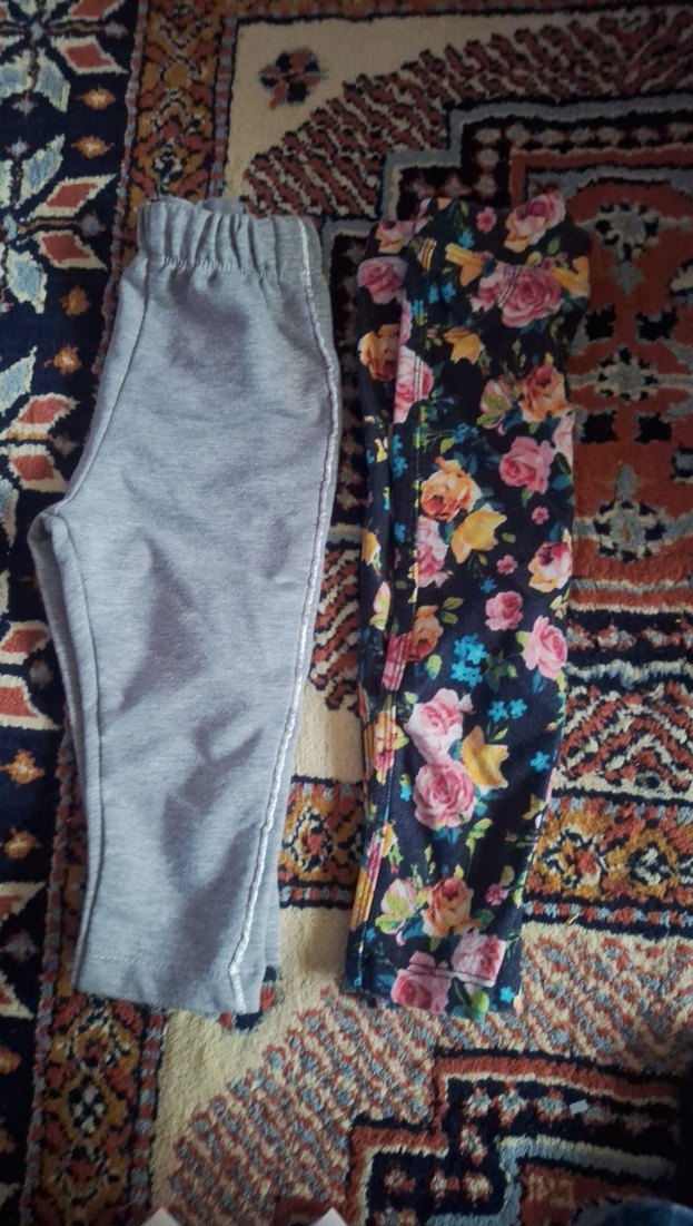 Kız çocukları için elastik bel bantlı, bol kesim iki tayt. Biri gri, diğeri çok renkli çiçek desenli, rahat ve günlük kullanıma uygun.