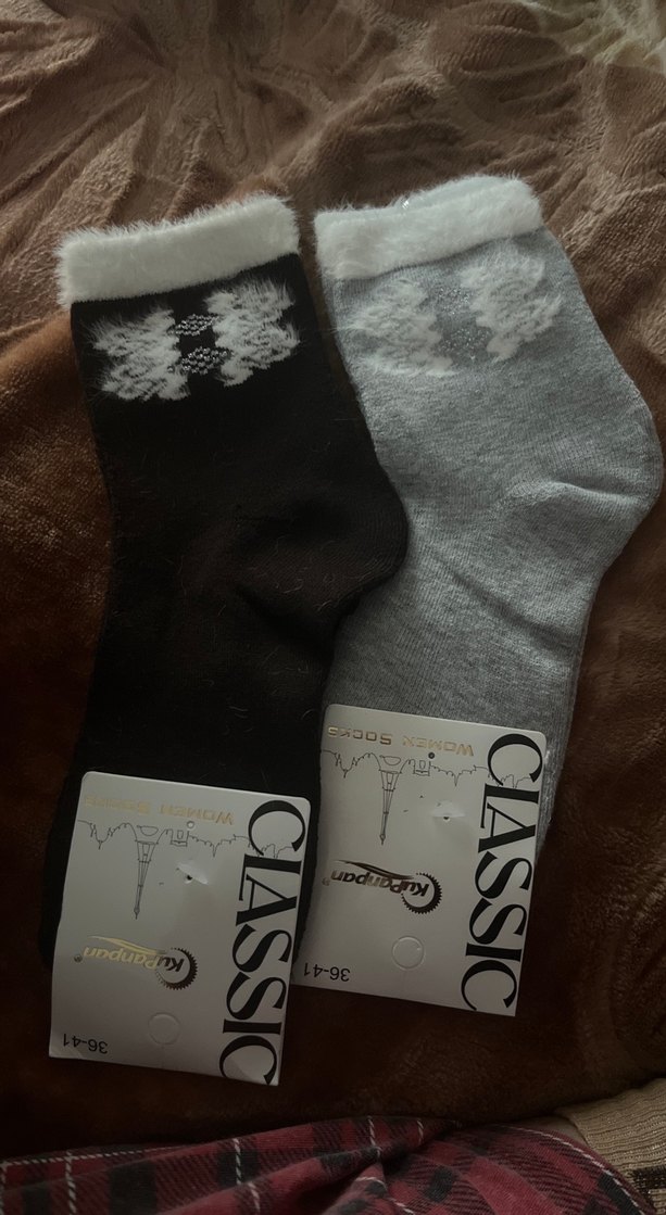 Gri ve siyah renklerde, yumuşak ve sıcak kumaştan kız çocuk çorapları. Hafif çiçek desenli ve tüylü manşetli. Classic etiketli.
