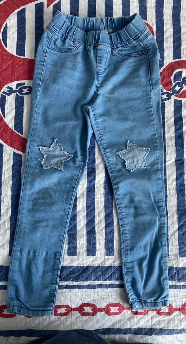 Mavi kot kumaştan, dizlerinde gri yıldız detaylı düğmeli kız çocuk pantolonu. Günlük rahatlık için uygun.