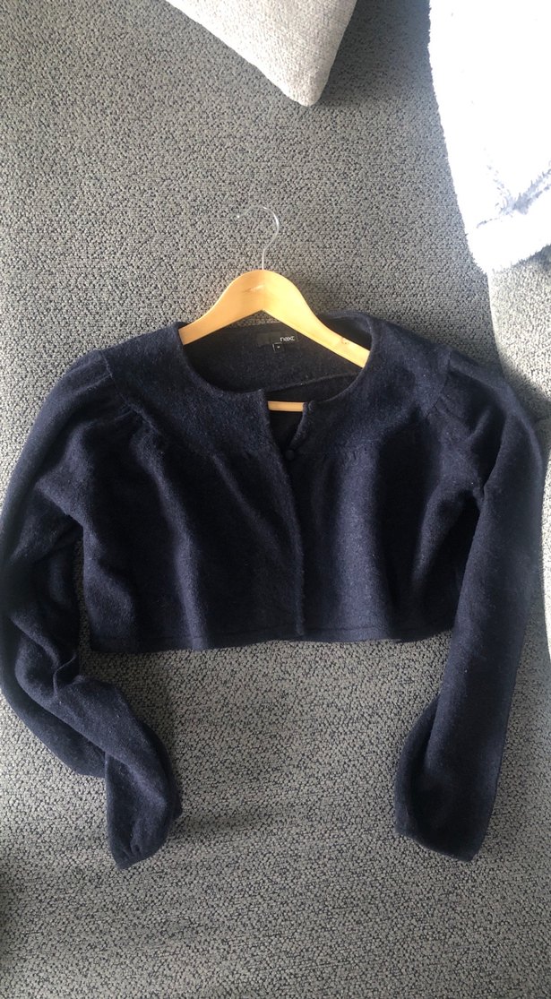 Koyu gri renkte, yün örgüden yapılmış, bisiklet yaka ve uzun kollu, vücuda oturan kız çocuk bolero. Normcore tarzında, sade ve günlük kullanıma uygun.