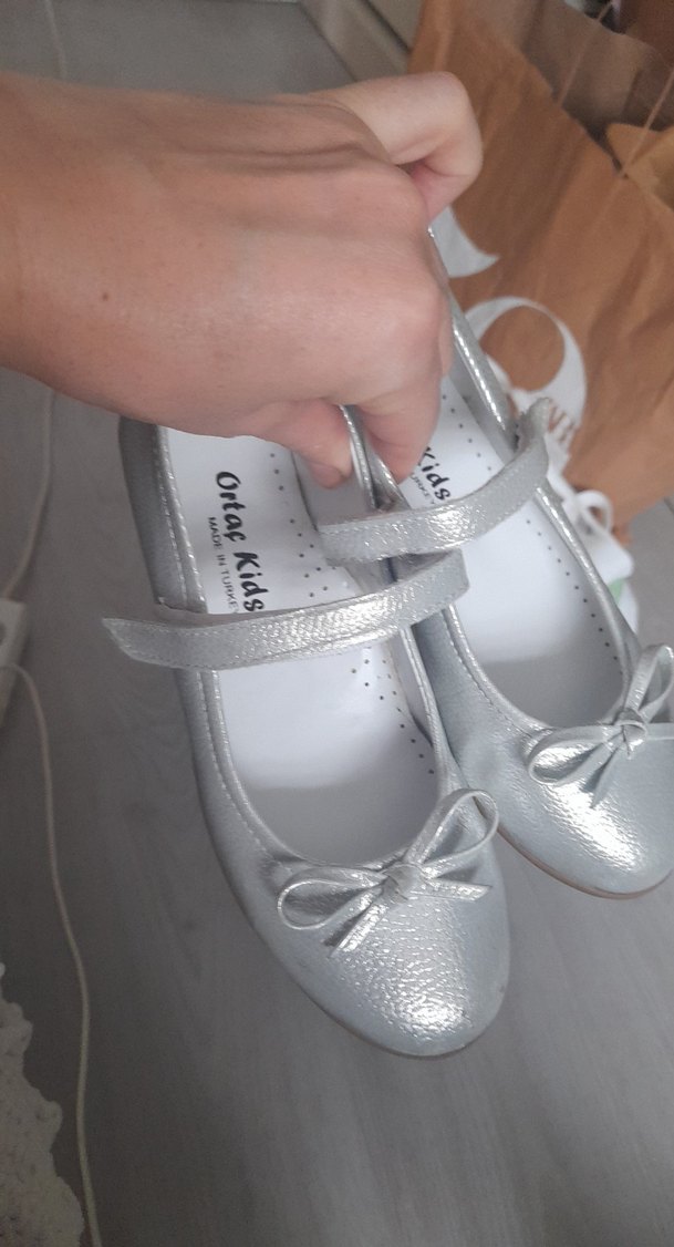 Kız çocukları için gümüş renkli, fiyonk detaylı ve bantlı kauçuk babet ayakkabılar. Sade ve klasik tasarım sunar.