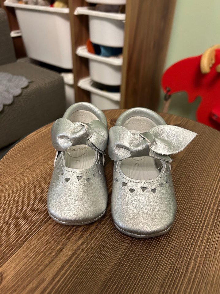 Gümüş renkli kız çocuk babetlerinde fiyonk detayı ve işleme kalp desenleri bulunur, çağdaş ve sade bir tasarıma sahiptir. Evde 1 kez giyildi tertemiz.