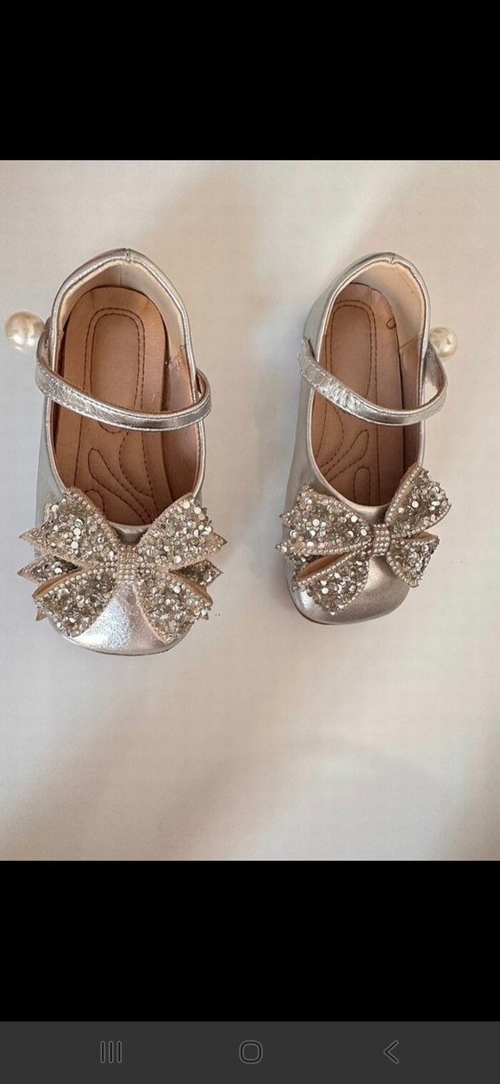 Parlak gümüş renkli, nakışlı fiyonk detaylı, metal bantlı kız çocuk babeti. Modern klasik tarzda. ✨