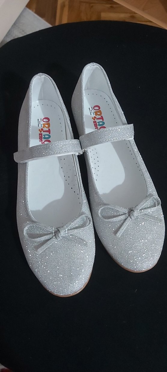 Kız çocukları için simli gri renkli, bantlı ve rahat babet. Yeni sıfır üründür.