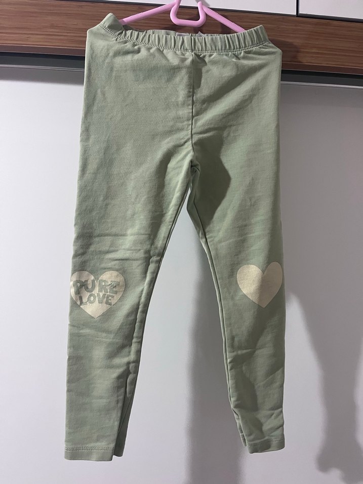 Kız çocukları için baskılı kalpli düğmeli haki tayt, pamuklu yumuşak kumaştan yapılmıştır. Rahat ve şık bir sokak stili sunar.