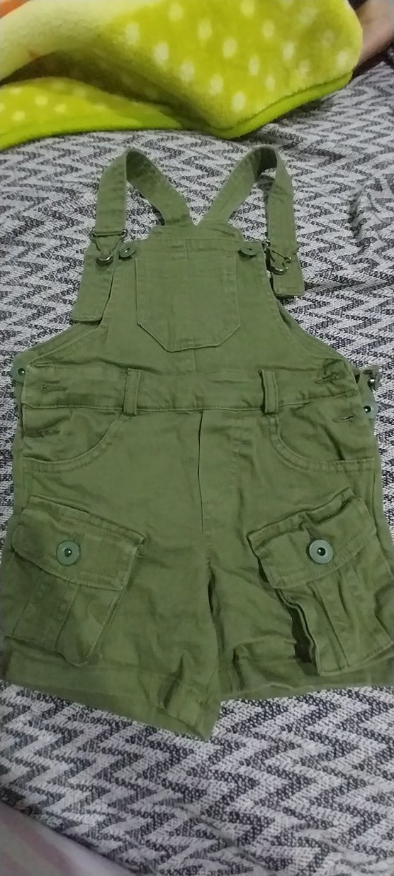 Düğmeli cepleri ve ayarlanabilir askıları olan, kamuflaj desenli, rahat kesim kolsuz haki tulum.