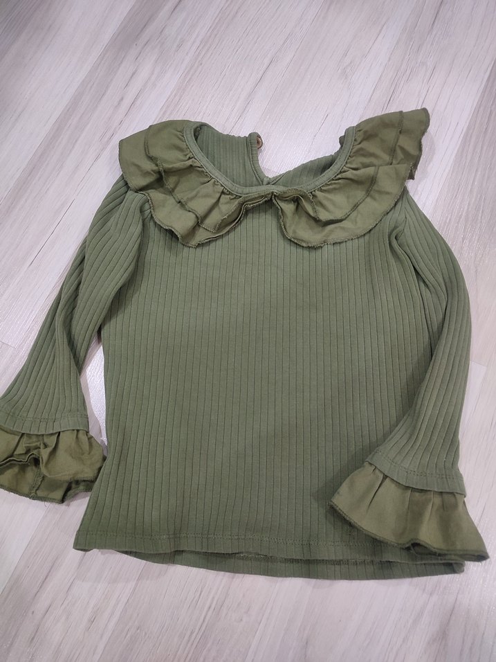Kız çocukları için haki renk, triko kumaştan yapılmış, uzun kollu ve yuvarlak yakalı, fırfırlı detaylara sahip dar kesim bluz.