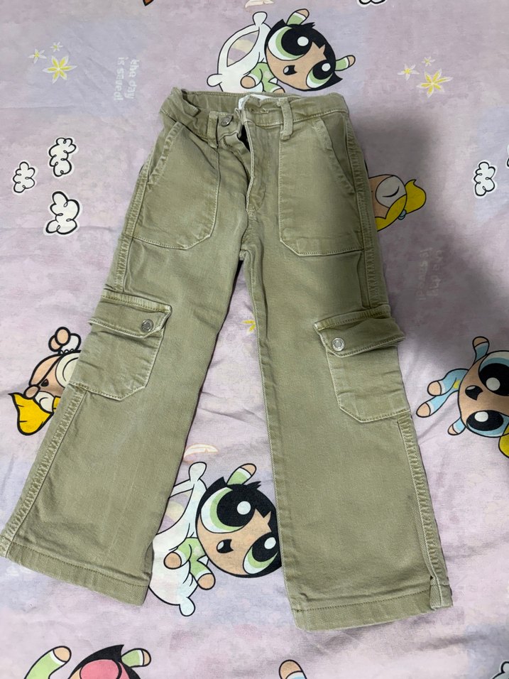 Haki renkli, bol kesim kot pantolon. 6 yaş ama 4-5e daha uygun kalıp dar