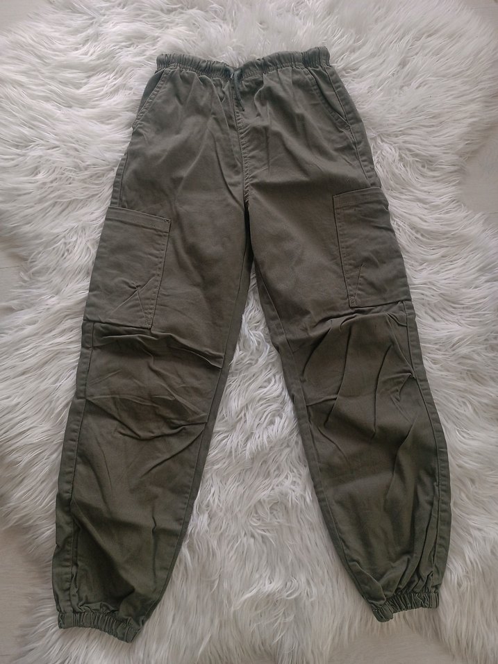 Sentetik kumaştan yapılmış, rahat kesim, midi boy, lastikli paça detaylı haki kadın pantolonu. Sokak stiline uygun, rahat ve şık bir görünüm sunar.