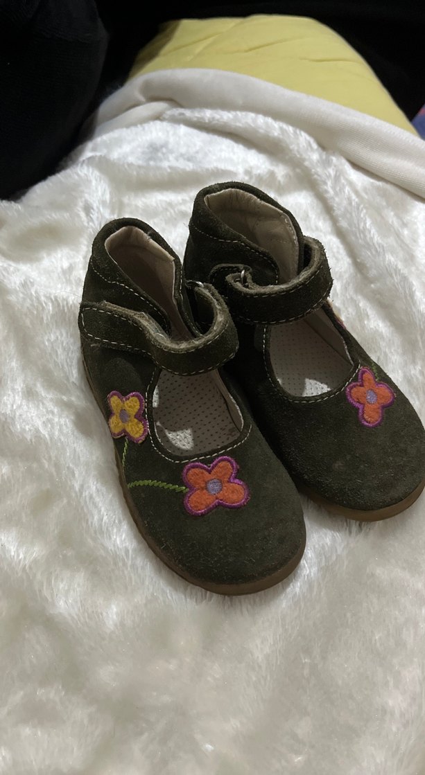 Haki süet kumaştan yapılmış, nakışlı çiçek desenli ve tokalı kız çocuk ayakkabıları.