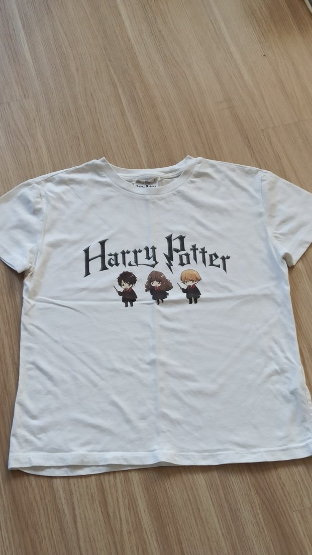 Pamuklu beyaz tişört, kısa kollu ve bol kesim. Üzerinde Harry Potter karakterleri baskılı, günlük sokak stili için uygun.