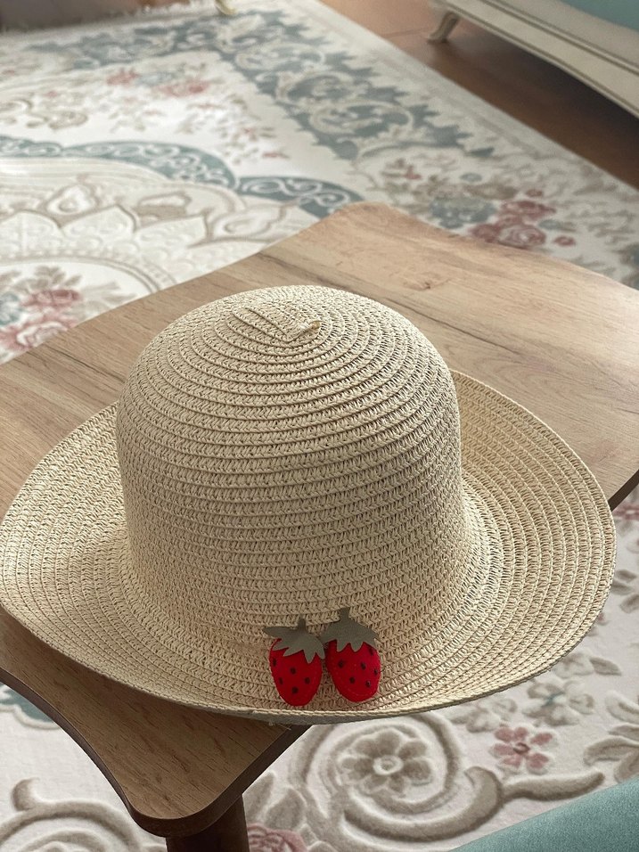 Hafif bej renkli, hasır örgü şapka. Çilek detaylarıyla retro ve hippie görünüme uygun. Kullanılmadı, alındığında bir tane çilek eksikti. 55 cm