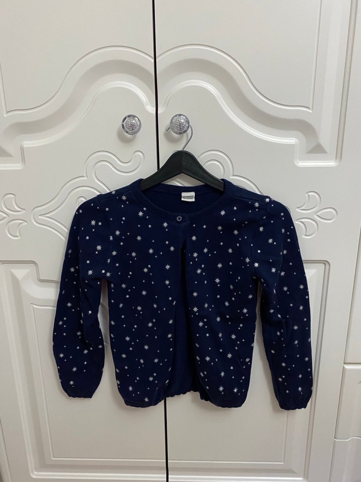 Kız çocukları için uzun kollu, düğmeli ve baskılı yıldız desenli lacivert hırka. Yumuşak ve sıcak kumaştan üretilmiştir.