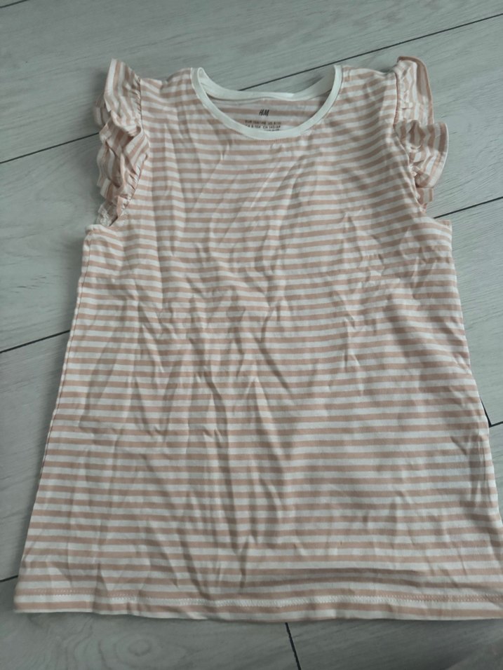 Kız çocuk tişörtü, kısa kollu ve fırfırlı detaylara sahip. Yuvarlak yaka ve bol kesimdir. Yumuşak pamuklu, pastel bej çizgili kumaştan yapılmıştır.
