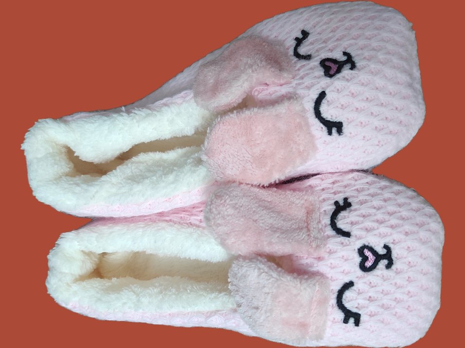 Pembe renkli, nakışlı ve figürlü sıcak tutan yumuşak örgü kadın ev ayakkabısı 36. 38 numara aralığında kalıbı biraz küçük.