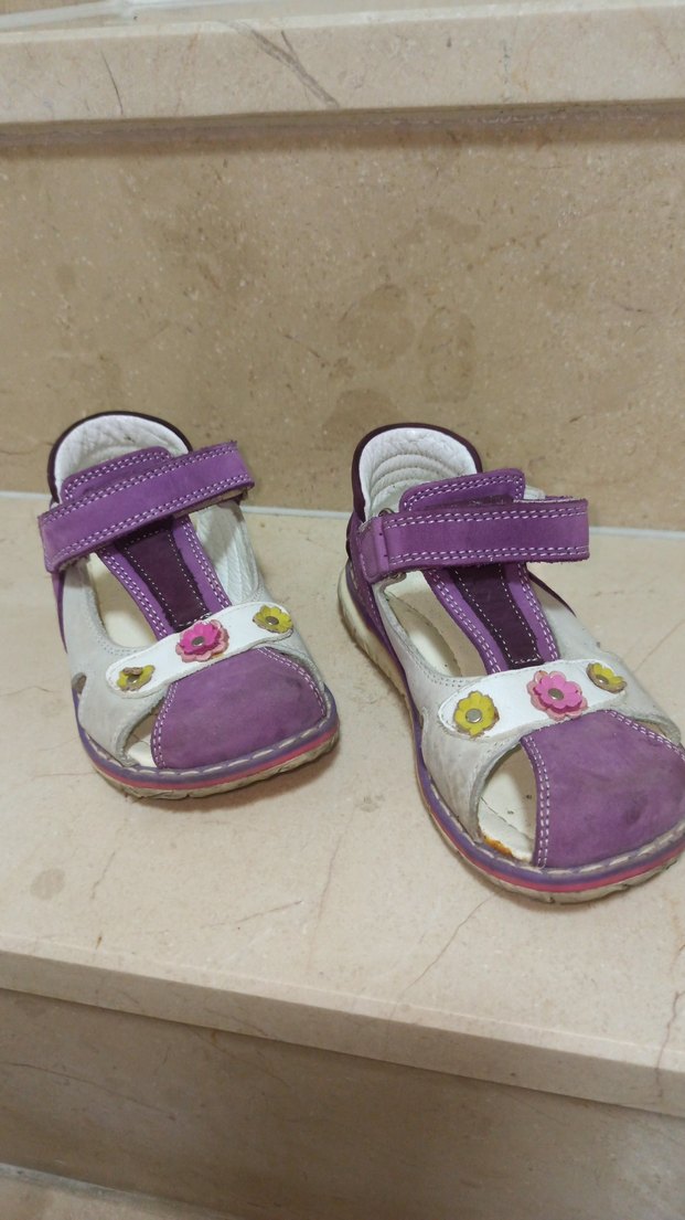 Mor renkte, velcro bantlı kız çocuk ilk adım ayakkabısı. Pastel tonlarda tie-dye deseni ve çiçek detaylarıyla bohem tarzını yansıtır. cirtcirtlarinin iç kısmında hafif soyulma olmuş ama giymeye engel değil