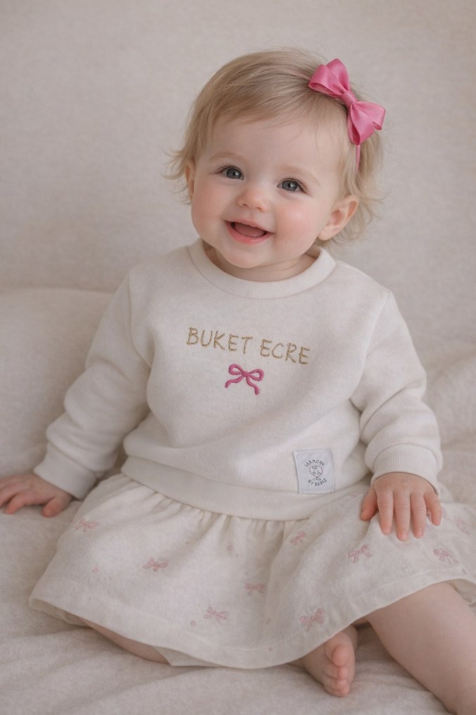 Kız çocukları için krem sweatshirt, bisiklet yaka, uzun kollu ve bol kesimdir. Yumuşak ve sıcak kumaştan yapılmış, nakışlı fiyonk ve isim bulunur. renk ve icon seçeneği için lütfen mesaj atınız. 0-5 yas grubu icin fiyat gecerlidir