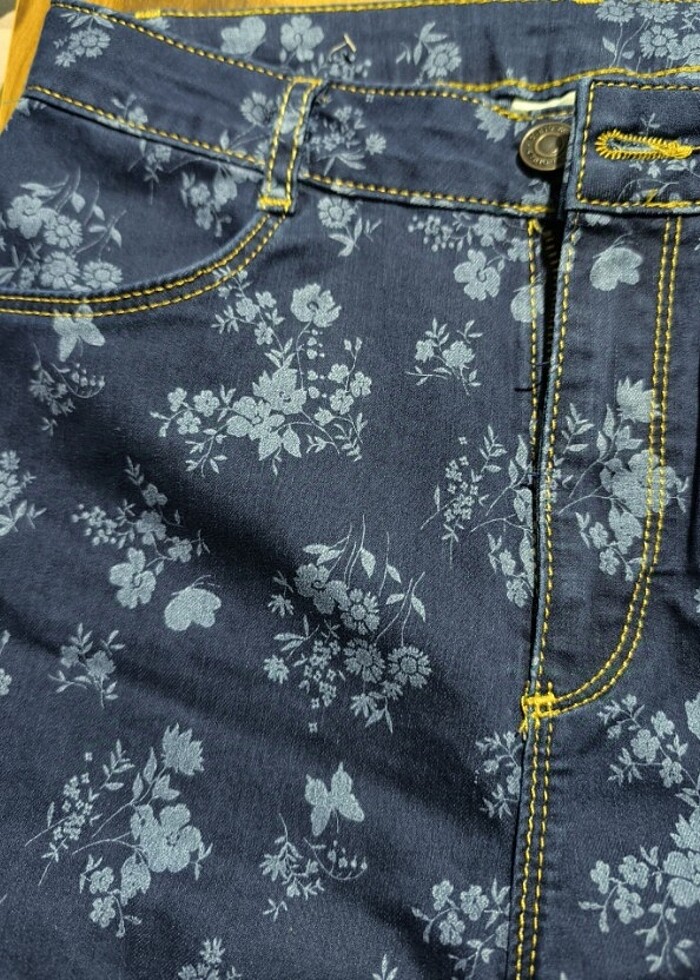Çiçek desenli kot pantolon. Etiketi üzerindedir, 0 üründür. Neredeyse sıfır ayarında, çok az ve çok temiz kullanılmıştır. Herhangi bir yerinde bir kusur yoktur. Beden: 13-14 yaş Boy: 156-160 cm