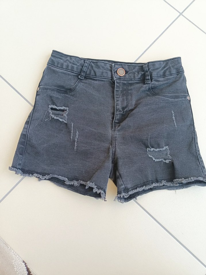 Düğmeli, gri renkli mini denim şort, bol kesim ve yırtık detaylarıyla rahat sokak stili için uygundur.