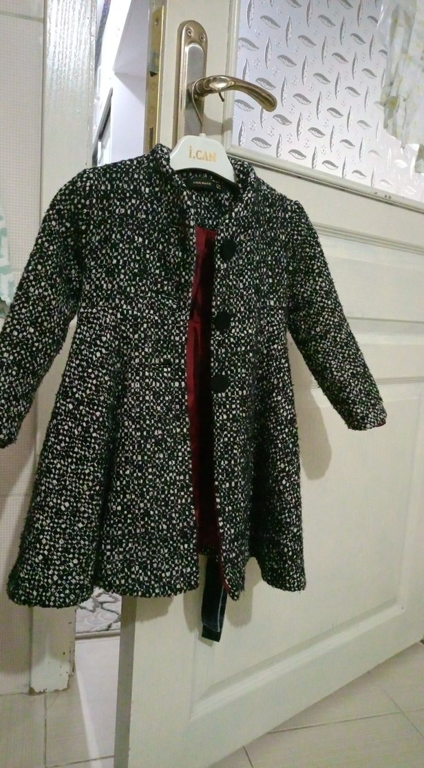 Düğmeli, yün kumaştan yapılmış, siyah kaban. Notlu yakalı, uzun kollu ve midi boyda, günlük kullanıma uygun şık bir parça.
