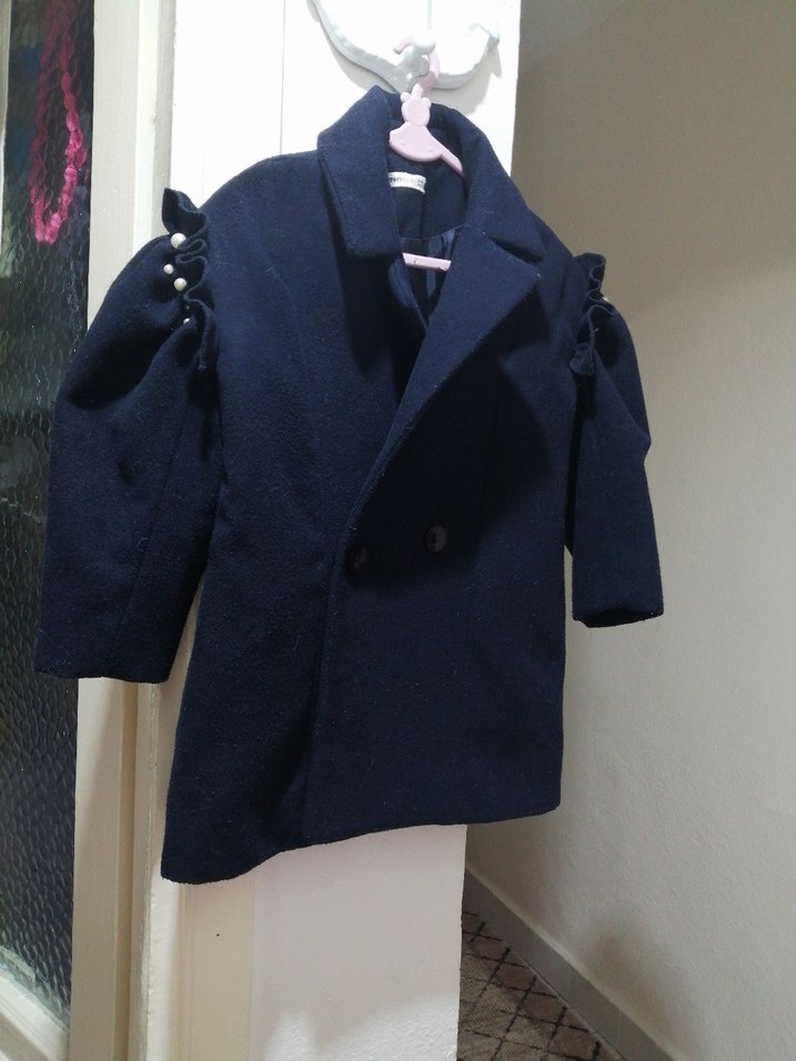 Sıyah düğmeli kız çocuk kabanı, notlu yaka ve rahat kesimle sokak stiline uygun, yumuşak ve sıcak kumaştan üretilmiştir. Kolların boncuk detayi vardır.