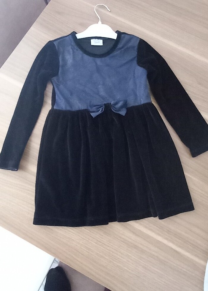 Kız çocuk uzun kollu kadife elbise.Resimlerde rengi soluk gibi çıksada çok net bir siyah kadife elbise çok şık duruyor. Etiketinde 4 yaş yazıyor ama kızım 3 yaşındayken çok rahat kullandı. Herhangi bir defosu renk solması yok.