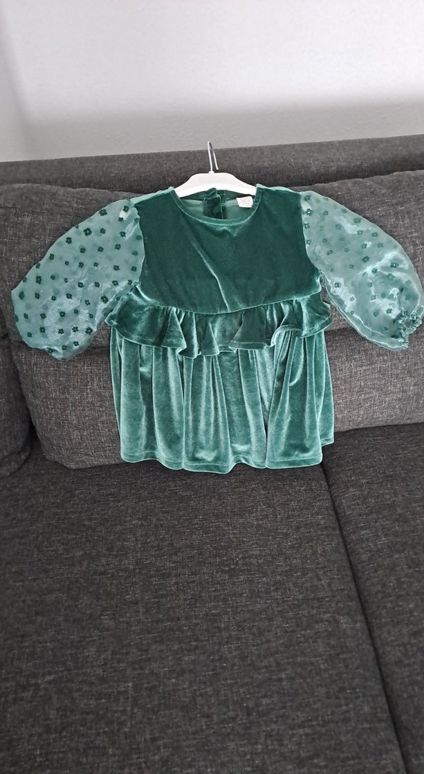 Kız Çocuk kadife Yeşil Fırfırlı Uzun Kollu Elbise