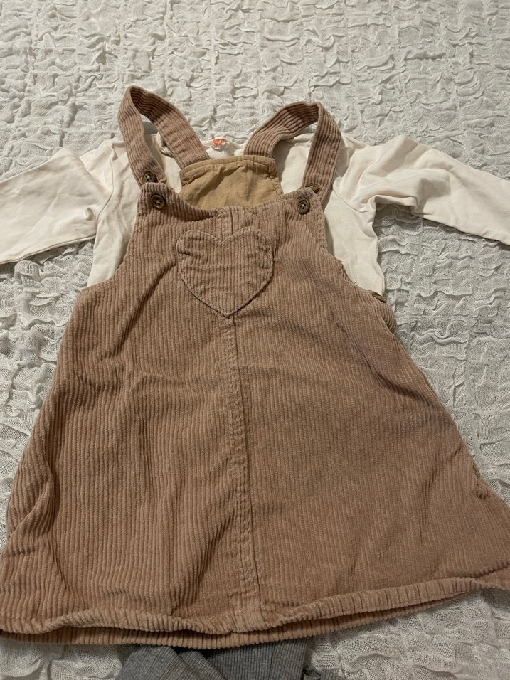 Kız çocukları için kahverengi askılı, düğmeli ve önünde kalp detayı olan bol kesim elbise. İçinde gri uzun kollu bluz bulunur.