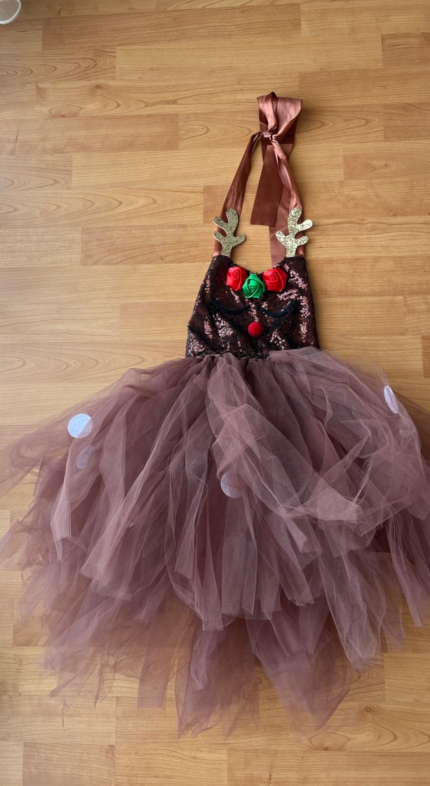 Kahverengi, straplez yakalı ve askılı, nakışlı desenlere sahip kız çocuk elbisesi. Renkli ve kabarık etek kısmı, yumuşak sentetik kumaştan üretilmiştir.