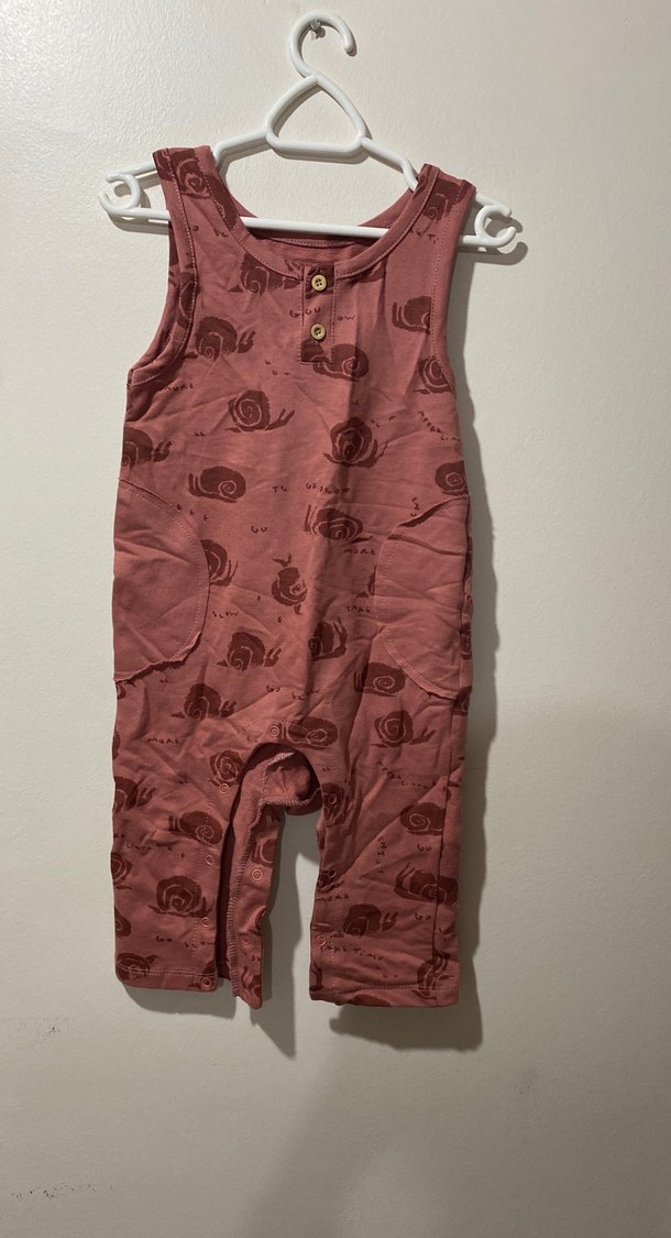 Kahverengi bağlama desenli, kolsuz, düğmeli, bol kesim kız çocuk tulumu. Yumuşak keten kumaştan, rahat sokak stili için uygun.
