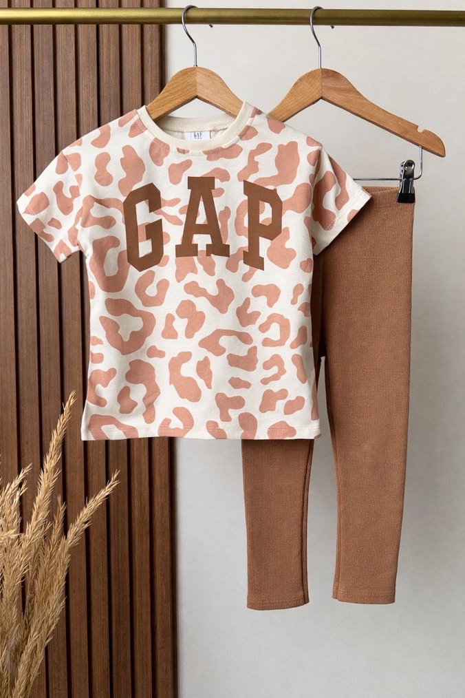 Kız çocukları için bol kesim, kısa kollu, baskılı tişört ve kahverengi pantolonlu eşofman takımı. Yumuşak ve sıcak kumaştan, rahat ve şık görünümlü. 3-4 YAŞ
