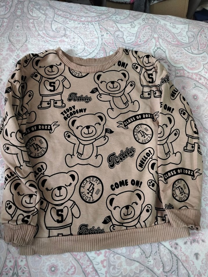Kız çocuk için bol kesim, uzun kollu, yuvarlak yaka ve örme dokulu sweatshirt. Yumuşak ve sıcak kumaştan, pastel kahverengi ve oyuncu ayıcık baskılarıyla. seç al beğen 40tl