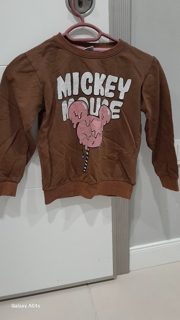 Kız çocukları için uzun kollu, bisiklet yaka ve bol kesim kahverengi sweatshirt. Yumuşak kumaştan, baskılı Mickey Mouse ve örme detaylı rahat sokak stili.