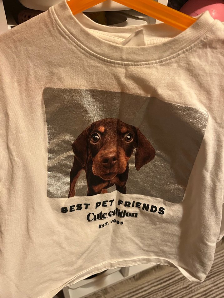 Pamuk kumaştan yapılmış, kahverengi baskılı köpek deseni olan, kısa kollu ve bisiklet yaka kız çocuk tişörtü. Rahat ve şık bir sokak stili için uygundur.