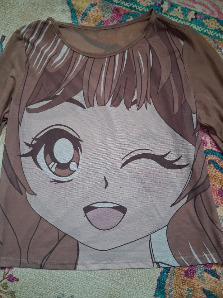 Kahverengi, baskılı, yuvarlak yaka, bol kesim kız çocuk uzun kollu tişört, sentetik kumaştan yapılmıştır. kolun birinde sökük vardır inceleme yapıp öyle alım yapınız.
