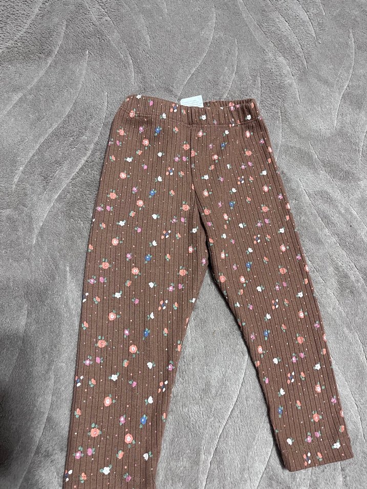 Kahverengi triko kumaştan, küçük çiçek desenli, dar kesim kız çocuk taytı. Street wear tarzına uygun.
