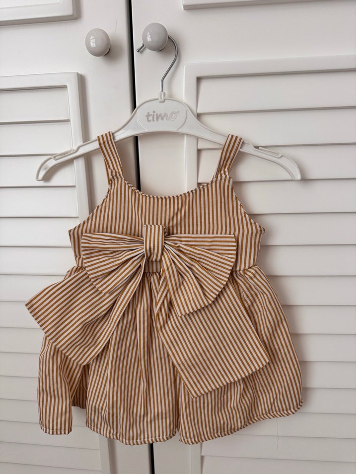 Kahverengi çizgili, bol kesim kız çocuk elbisesi, belinde büyük fiyonk detaylı. Yumuşak sentetik kumaştan, askılı ve rahat kesim.