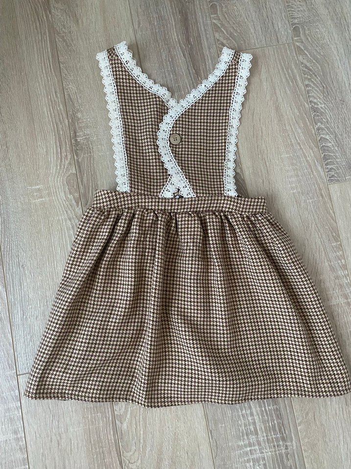 Ürün kullanılmadı temiz Kahverengi ekose desenli, dantel detaylı askılı, V yakalı, rahat kesim kız çocuk elbisesi, yumuşak örme kumaştan üretilmiştir.