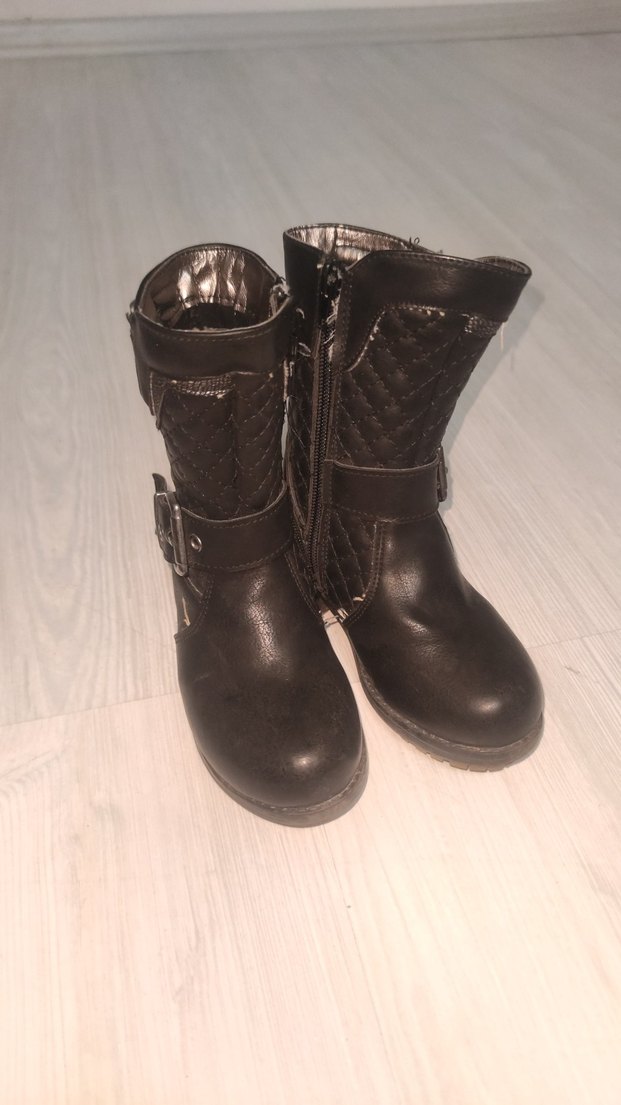 Kız çocukları için koyu kahverengi deri biker botlar, tokalı kayışlar ve kapitone detaylarla trend bir görünüm sunar. Yan fermuar ile kolay kullanım sağlar.