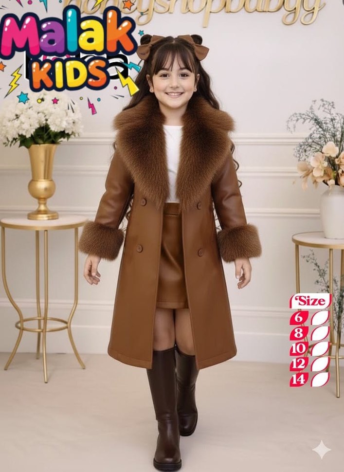 Kız Çocuk Kahverengi Deri Kürk Detaylı Kaban
