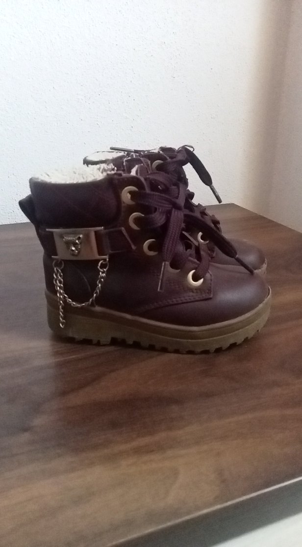Koyu kahverengi deri kız çocuk botları, tokalı detay ve zincir aksanlı, bağcıklı ve sağlam tabanlı. Gotik tarzda, trend günlük görünümlü.