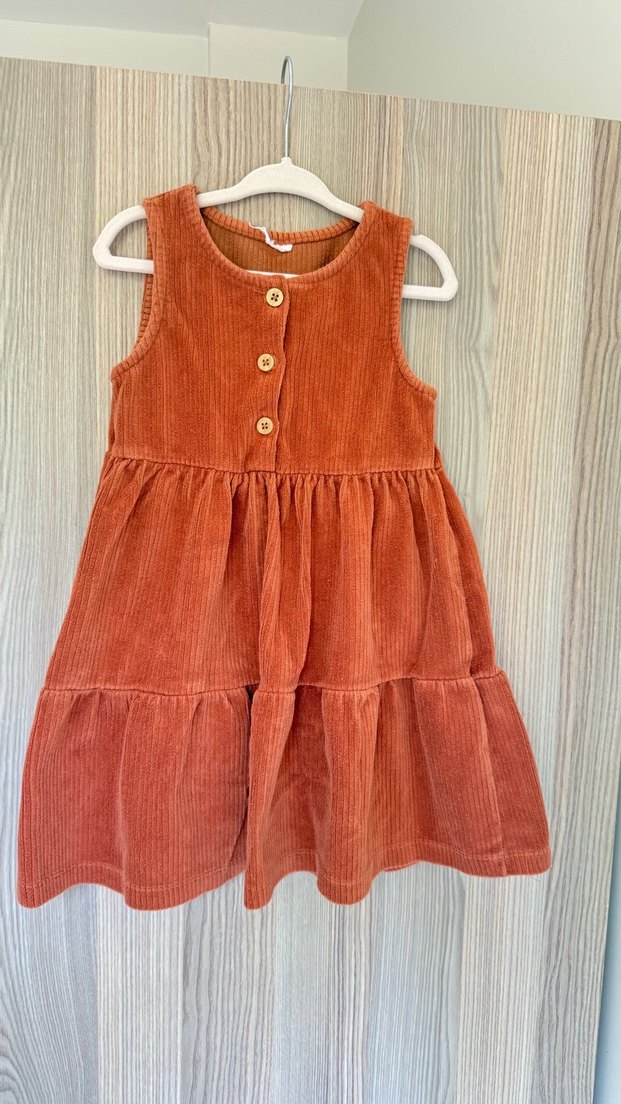 Kız çocukları için düğmeli, kahverengi fitilli kadife kumaştan, salaş kesim elbise. Kolsuz ve bohem tarzda, yuvarlak yaka ile tasarlanmıştır.
