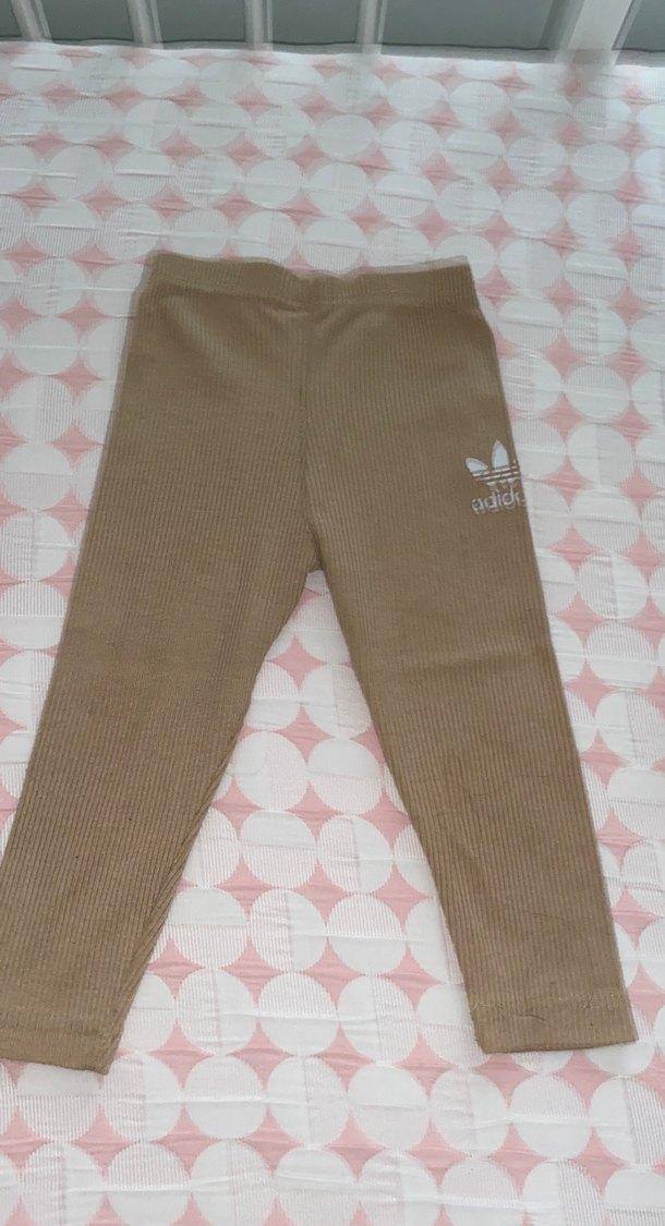 Kız çocukları için kahverengi, esnek bel bantlı, yumuşak sentetik kumaştan yapılmış dar kesim tayt. Adidas logosu bulunur.