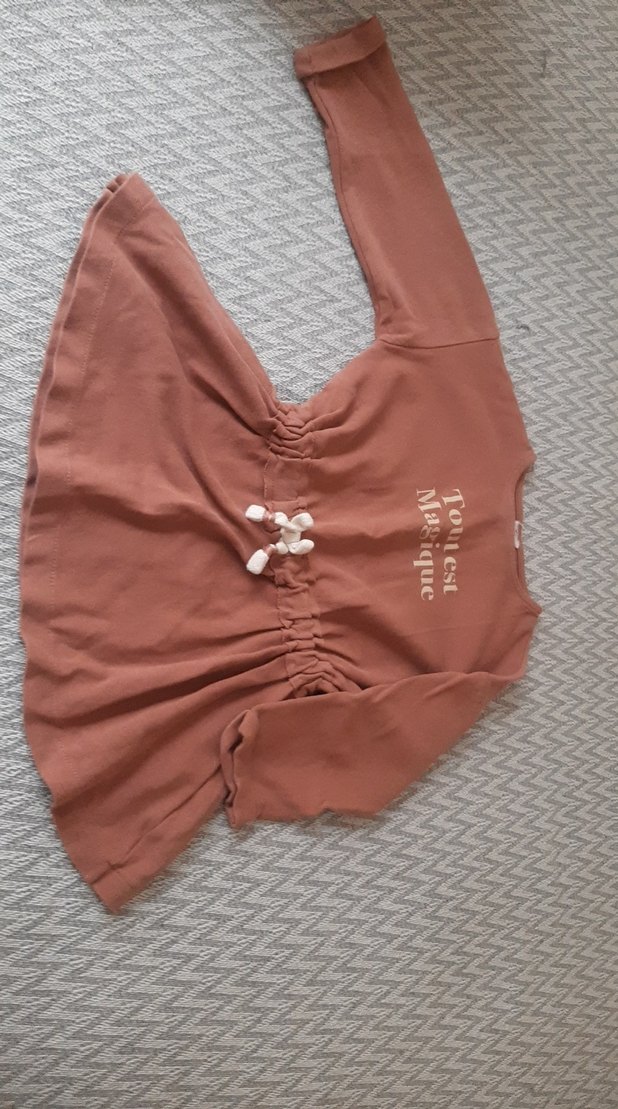 Kahverengi, uzun kollu, yuvarlak yaka, bol kesim kız çocuk elbiseÖnde fırfır ve baskı detayları bulunur.