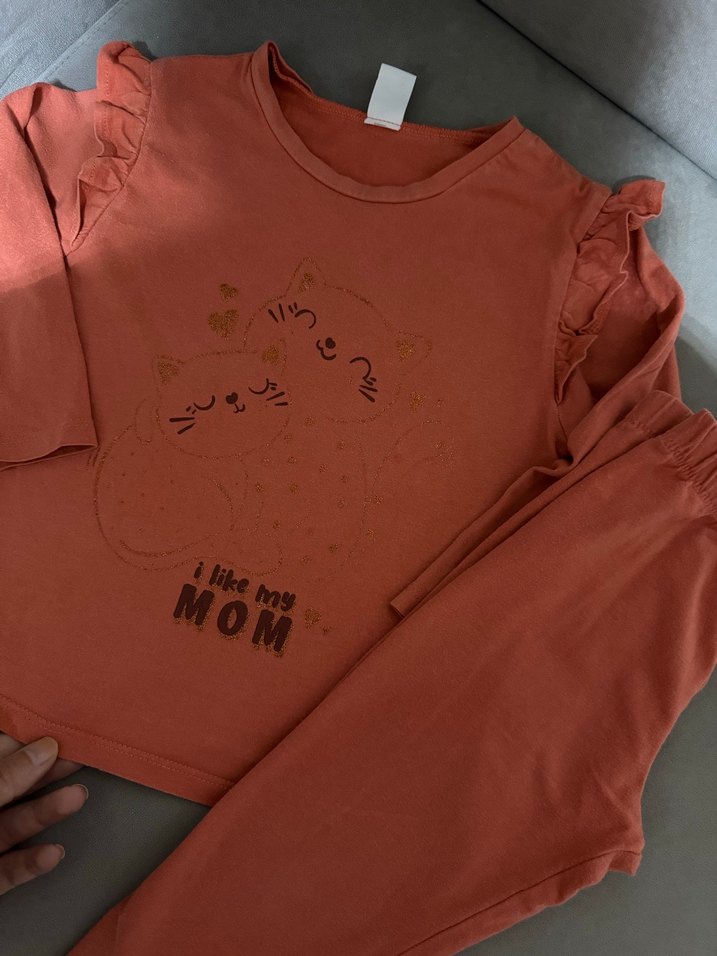 Kahverengi uzun kollu, bol kesim kız çocuk tişörtü, yuvarlak yaka ve omuzlarda fırfır detaylara sahiptir. Yumuşak, sıcak kumaştan üretilmiş, üzerinde 'I like my MOM' yazılı kedi baskısı bulunur .