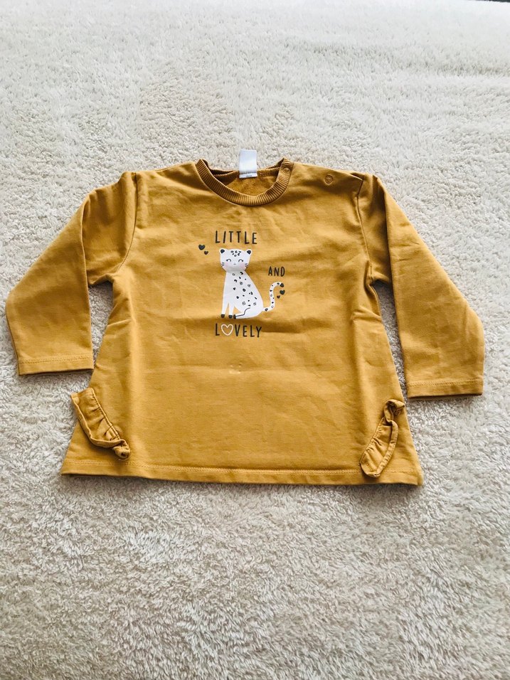 Kahverengi uzun kollu kız çocuk tişörtü, bol kesim ve yanlarda fırfır detaylarıyla. Önünde renkli baskı ve yuvarlak yaka bulunur.