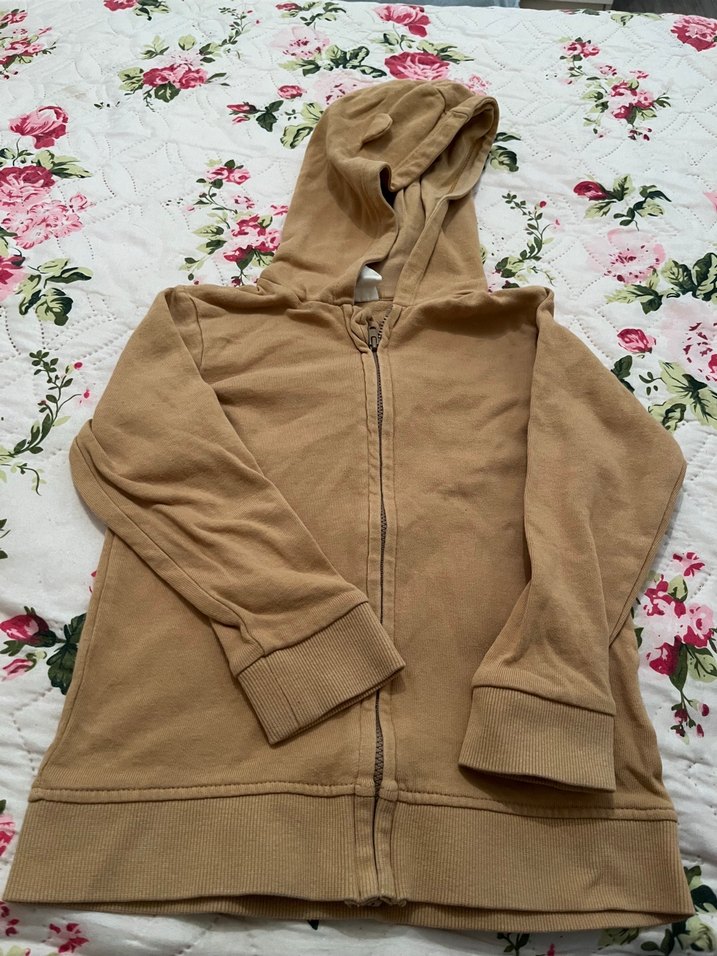 Kahverengi, bol kesim kız çocuk ceket, kapüşonlu ve ön fermuarlıdır. Yumuşak ve sıcak kumaştan üretilmiş, günlük sokak stili için uygundur.
