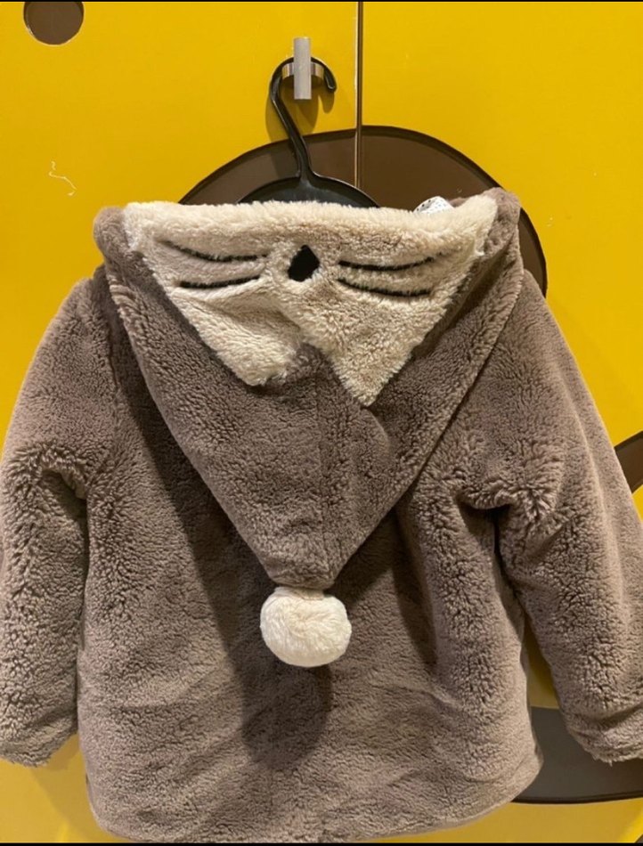 Kız çocukları için kahverengi ve gri tonlarında, kapüşonunda kürk detaylı ve baskılı desenli, bol kesim peluş ceket. Rahat sokak stili için uygundur.