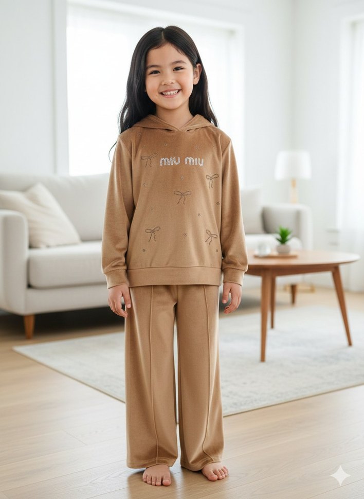 Kız Çocuk Kahverengi Kapüşonlu Sweatshirt ve Eşofman kadife