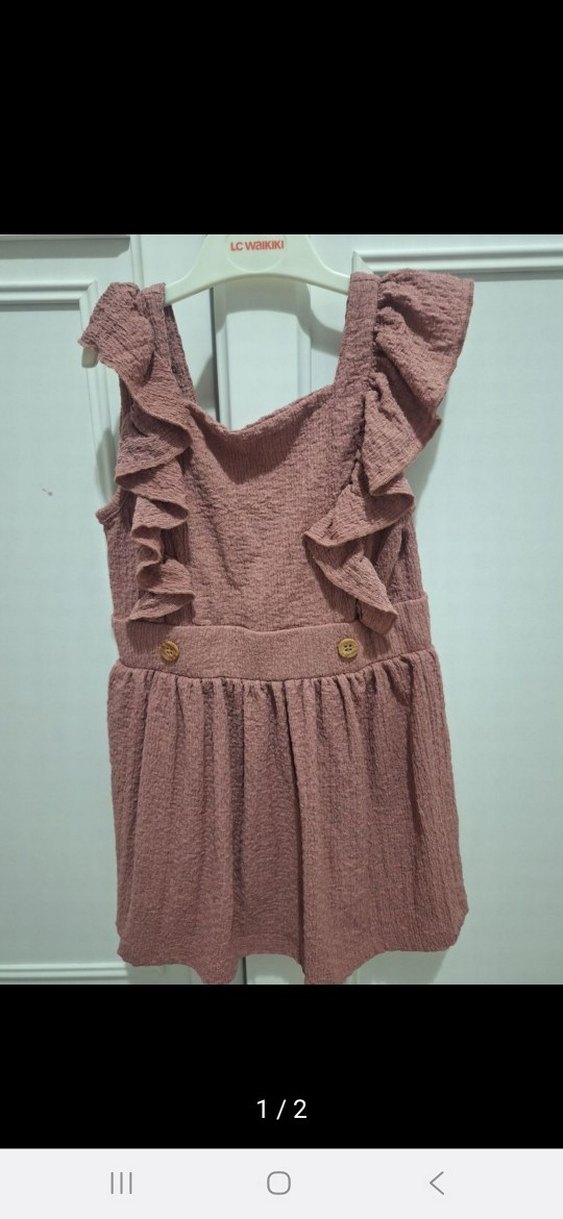 Kız çocukları için keten kumaştan, V yakalı, fırfırlı ve salaş kesime sahip kahverengi bohem tarzda kolsuz elbise. Ahşap düğme detayları vardır.